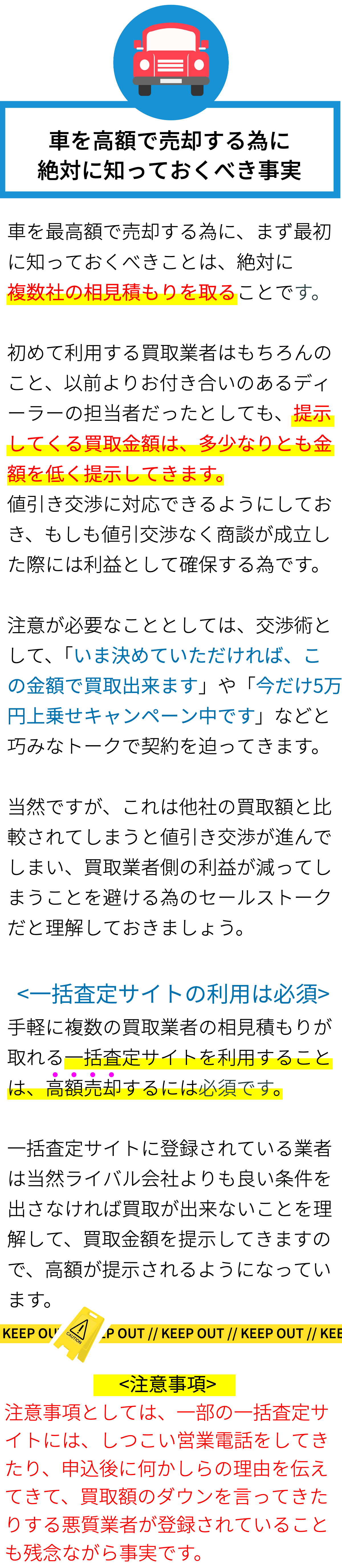 一括査定サービスを利用するもう一つの大きなメリットは、複数の業者から提示される査定額を簡単に比較できる点です。各社ごとに異なる査定基準や評価ポイントがあるため、一社だけで査定を受けると、最も高い査定額を逃してしまう可能性があります。複数の査定結果を一目で確認できるため、利用者は市場の相場感を把握しながら、最も魅力的な条件を選択することができ、結果として高額での買取が実現しやすくなります。